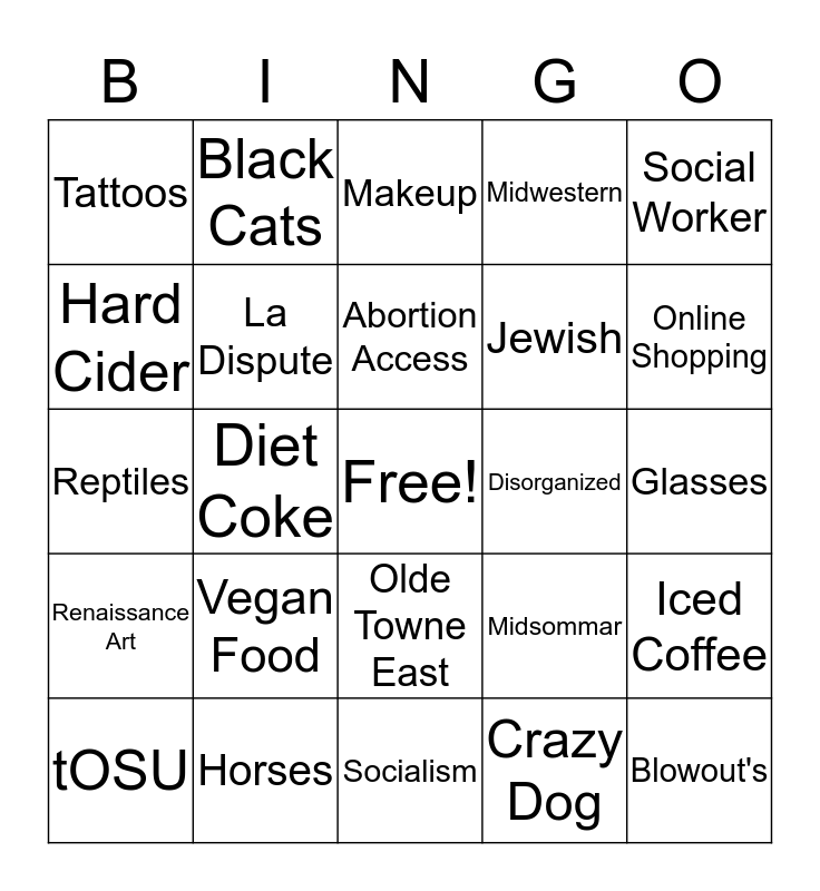 This bingo card has a free space and 24 words: Vegan Food, Horses, Abortion Access, tOSU, Social Worker, Tattoos, Hard Cider, Black Cats, Disorganized, Olde Towne East, Jewish, Reptiles, Midsommar, Iced Coffee, La Dispute, Crazy Dog, Glasses, Makeup, Online Shopping, Diet Coke, Blowout's, Renaissance Art, Midwestern and Socialism.