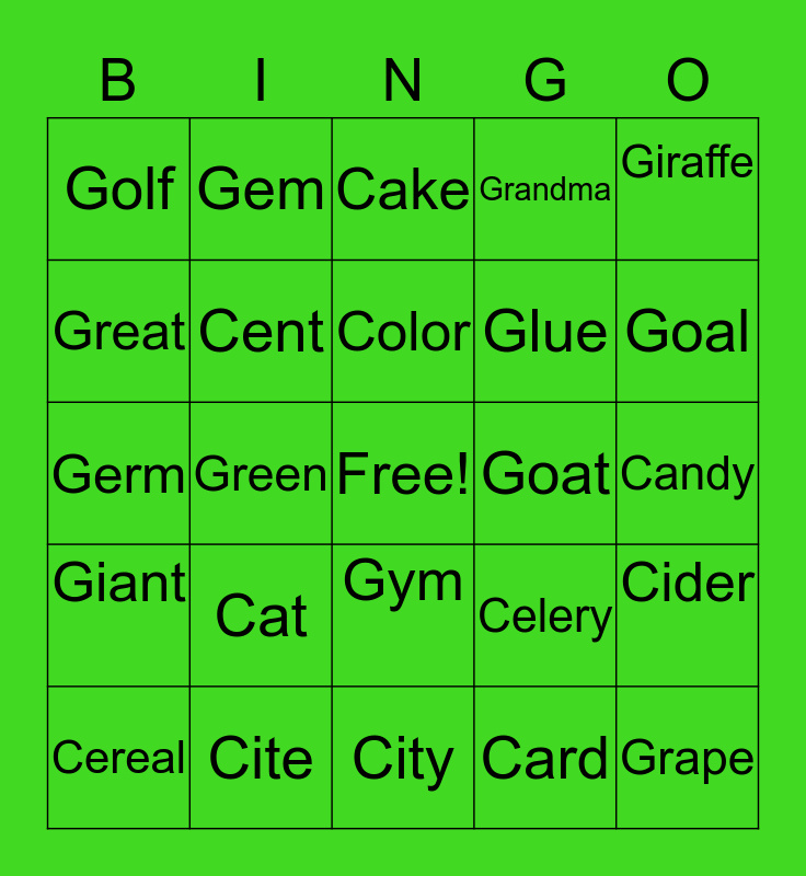 This bingo card has a free space and 24 words: Cat, Cite, Color, Cereal, Giraffe, Golf, Great, Gem, Goat, Gym, Glue, Germ, Celery, Cider, Cent, Card, Candy, Cake, Goal, Green, Grape, Giant, Grandma and City.