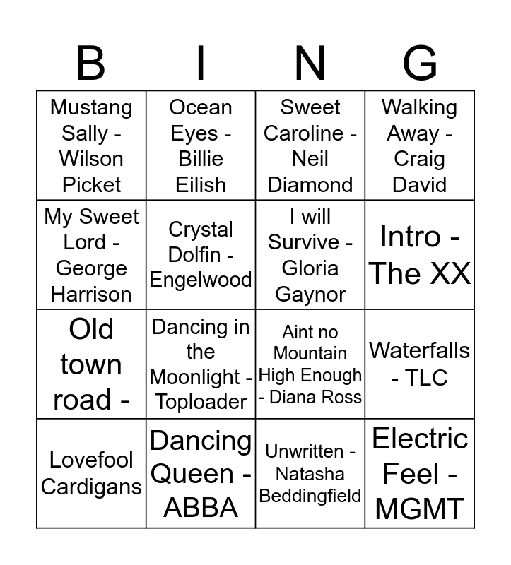 This bingo card has 30 words: Should I stay or Should I go - The Clash, Purple Rain - Prince, Waterfalls - TLC, Bohemian Rhapsody - Queen, Mustang Sally - Wilson Picket, Sweet Caroline - Neil Diamond, I will Survive - Gloria Gaynor, Fresh Prince of Bell Air, Dancing Queen - ABBA, Fast Car - Tracy Chapman, Unwritten - Natasha Beddingfield, Lovefool Cardigans, Free!, Could you be loved - Bob Marley, Dancing in the Moonlight - Toploader, Riverdance (hup!), Closing Time - Semisonic, Electric Feel - MGMT, Under Pressure - Queen, My Sweet Lord - George Harrison, Aint no Mountain High Enough - Diana Ross, Dancing on my own - Robyn, Ocean Eyes - Billie Eilish, Old town road -, Crystal Dolfin - Engelwood, Walking Away - Craig David, Uptown Funk - Bruno Mars, Cold As Ice - Foreigner, Intro - The XX and September - Earth Wind and Fire.