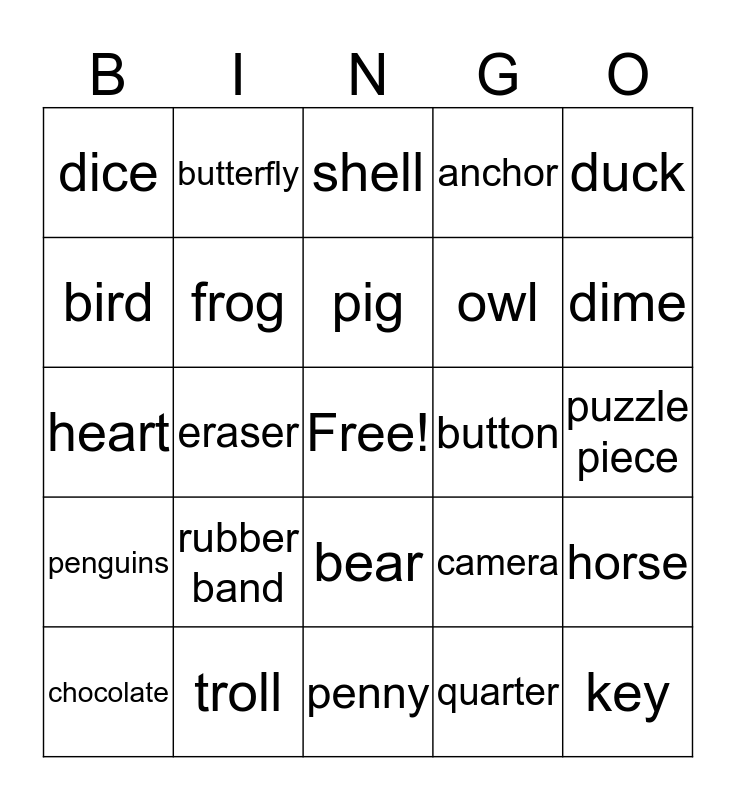 This bingo card has a free space and 29 words: chocolate, jelly bean, eraser, paperclip, dice, shell, frog, rubber band, button, troll, puzzle piece, key, penny, quarter, dime, k-cup, bear, penguins, duck, heart, camera, rose, owl, bird, anchor, butterfly, horse, pig and bee.
