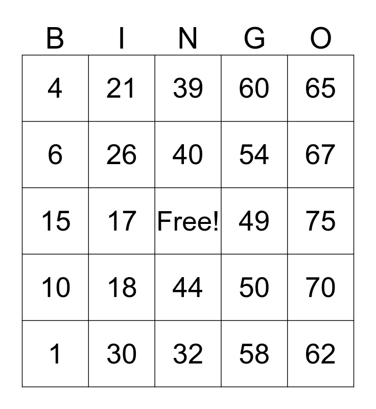 This bingo card has a free space and 24 words: 1, 18, 40, 58, 65, 4, 21, 39, 49, 75, 15, 26, 50, 70, 6, 30, 32, 60, 67, 10, 17, 44, 54 and 62.