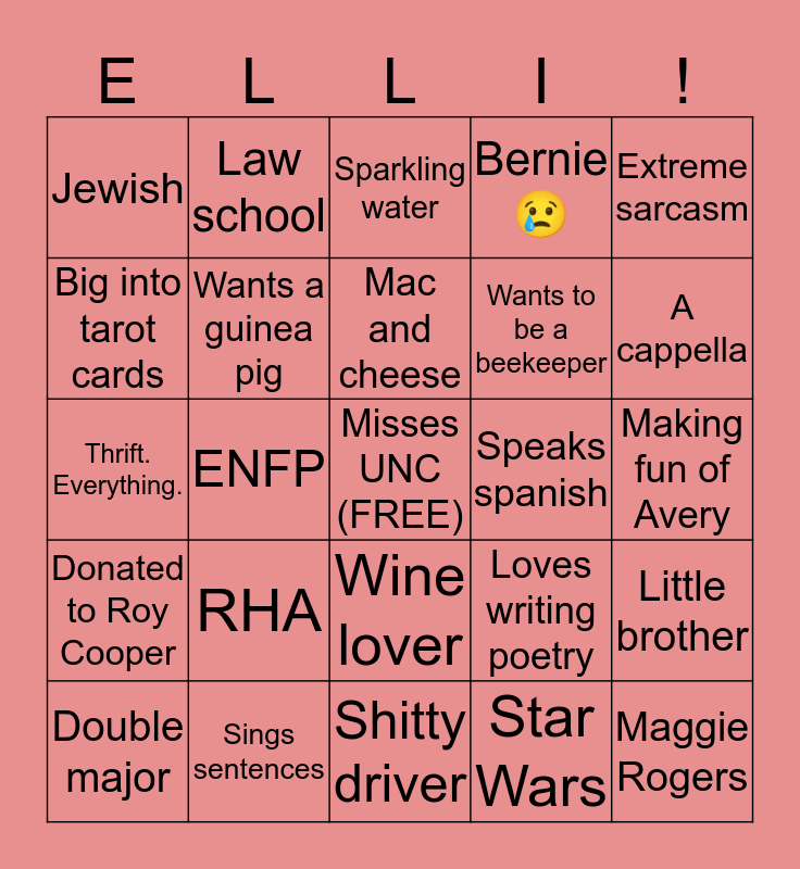 This bingo card has a free space and 24 words: RHA, Sings sentences, Mac and cheese, Double major, Extreme sarcasm, Jewish, Big into tarot cards, Law school, Speaks spanish, Wine lover, Wants to be a beekeeper, Thrift. Everything., Loves writing poetry, Little brother, Wants a guinea pig, Star Wars, Making fun of Avery, Sparkling water, A cappella, ENFP, Maggie Rogers, Donated to Roy Cooper, Bernie 😢 and Shitty driver.