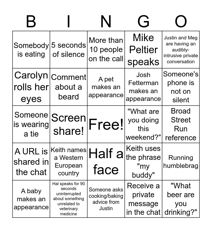 This bingo card has a free space and 24 words: Keith names a Western European country, Hal speaks for 90 seconds uninterrupted about something unrelated to veterinary medicine, A pet makes an appearance, A baby makes an appearance, Justin and Meg are having an audibly-intrusive private conversation, Somebody is eating, Carolyn rolls her eyes, 5 seconds of silence, "What are you doing this weekend?", Half a face, Josh Fetterman makes an appearance, Someone is wearing a tie, Keith uses the phrase "my buddy", Running humblebrag, Comment about a beard, Receive a private message in the chat, Broad Street Run reference, More than 10 people on the call, Someone's phone is not on silent, Screen share!, "What beer are you drinking?", A URL is shared in the chat, Mike Peltier speaks and Someone asks cooking/baking advice from Justin.