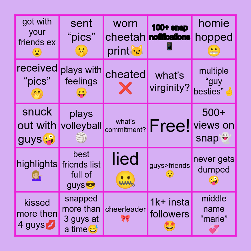 This bingo card has a free space and 24 words: best friends list full of guys๐, snapped more than 3 guys at a time๐ , cheated โ, kissed more then 4 guys๐, homie hopped ๐ฌ, got with your friends ex ๐ฎ, received โpicsโ ๐คญ, sent โpicsโ ๐คซ, Free!, lied ๐ค, whatโs virginity?, snuck out with guys๐คช, guys>friends๐ฏ, never gets dumped๐คช, plays with feelings๐, 1k+ insta followers๐คฉ, 500+ views on snap๐ป, worn cheetah print๐ผ, multiple โguy bestiesโ๐ค, plays volleyball๐, middle name โmarieโ ๐, highlights๐๐ผโโ๏ธ, 100+ snap notifications๐ฑ and cheerleader๐.