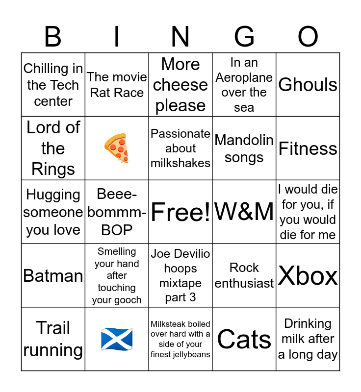 This bingo card has a free space and 24 words: Smelling your hand after touching your gooch, 🏴, Passionate about milkshakes, Trail running, Ghouls, Chilling in the Tech center, Lord of the Rings, The movie Rat Race, W&M, Joe Devilio hoops mixtape part 3, Mandolin songs, Hugging someone you love, Rock enthusiast, Xbox, 🍕, Cats, I would die for you, if you would die for me, More cheese please, Fitness, Beee-bommm-BOP, Drinking milk after a long day, Batman, In an Aeroplane over the sea and Milksteak boiled over hard with a side of your finest jellybeans.