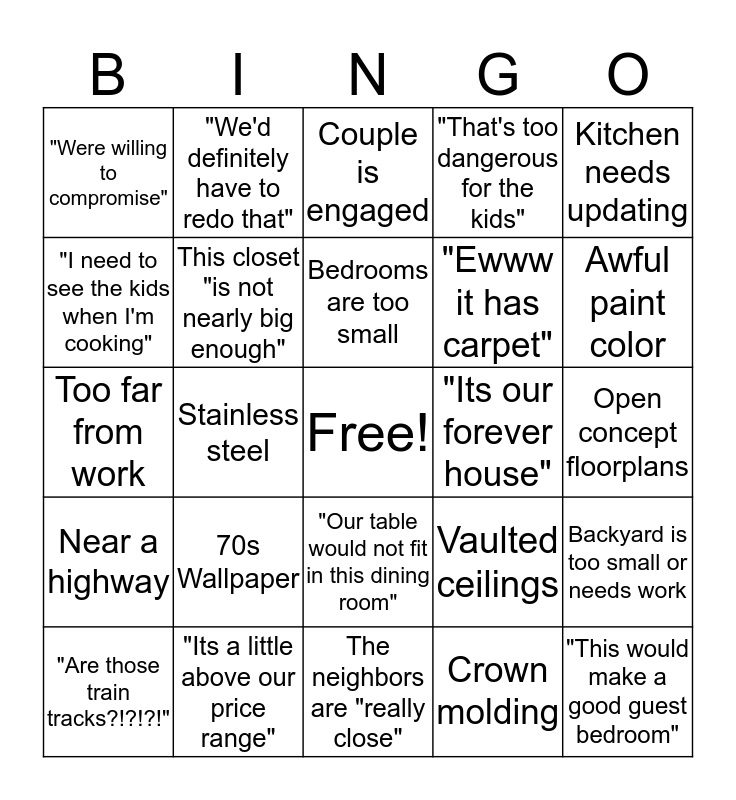 This bingo card has a free space and 24 words: 70s Wallpaper, "Its a little above our price range", Bedrooms are too small, "Are those train tracks?!?!?!", Kitchen needs updating, "Were willing to compromise", "I need to see the kids when I'm cooking", "We'd definitely have to redo that", "Its our forever house", "Our table would not fit in this dining room", "Ewww it has carpet", Too far from work, Vaulted ceilings, Backyard is too small or needs work, This closet "is not nearly big enough", Crown molding, Open concept floorplans, Couple is engaged, Awful paint color, Stainless steel, "This would make a good guest bedroom", Near a highway, "That's too dangerous for the kids" and The neighbors are "really close".