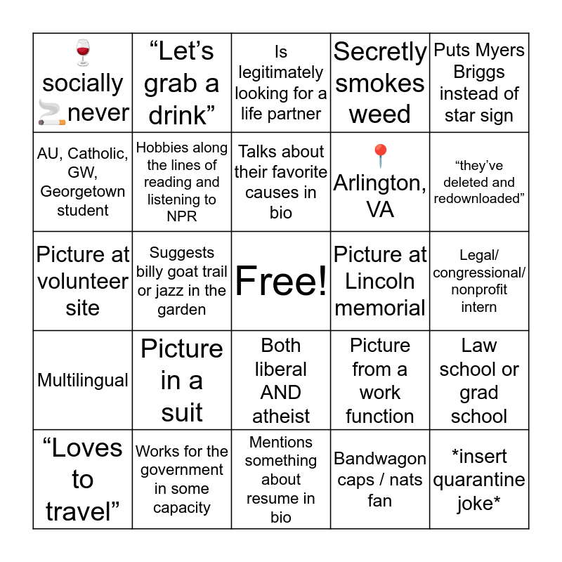 This bingo card has a free space and 24 words: Picture in a suit, Works for the government in some capacity, Talks about their favorite causes in bio, “Loves to travel”, Puts Myers Briggs instead of star sign, 🍷socially 🚬never, AU, Catholic, GW, Georgetown student, “Let’s grab a drink”, Picture at Lincoln memorial, Both liberal AND atheist, 📍Arlington, VA, Picture at volunteer site, Picture from a work function, Law school or grad school, Hobbies along the lines of reading and listening to NPR, Bandwagon caps / nats fan, Legal/ congressional/ nonprofit intern, Is legitimately looking for a life partner, “they’ve deleted and redownloaded”, Suggests billy goat trail or jazz in the garden, *insert quarantine joke*, Multilingual, Secretly smokes weed and Mentions something about resume in bio.