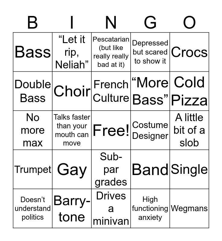This bingo card has a free space and 24 words: Gay, Barry-tone, French Culture, Doesn’t understand politics, Crocs, Bass, Double Bass, “Let it rip, Neliah”, Costume Designer, Sub-par grades, “More Bass”, No more max, Band, Single, Choir, High functioning anxiety, A little bit of a slob, Pescatarian (but like really really bad at it), Cold Pizza, Talks faster than your mouth can move, Wegmans, Trumpet, Depressed but scared to show it and Drives a minivan.