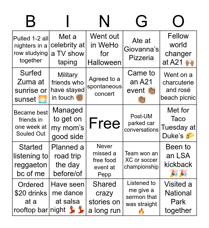 This bingo card has a free space and 24 words: Planned a road trip the day before/of, Have seen me dance at salsa night ๐๐ฝ๐๐ฝ, Agreed to a spontaneous concert, Ordered $20 drinks at a rooftop bar, Fellow world changer at A21 ๐๐ฝ, Pulled 1-2 all nighters in a row studying together, Surfed Zuma at sunrise or sunset ๐ , Met a celebrity at a TV show taping, Post-UM parked car conversations, Never missed a free food event at Pepp, Came to an A21 event ๐๐ฝ๐๐ฝ, Became best friends in one week at Souled Out, Team won an XC or soccer championship, Been to an LSA kickback ๐๐, Military friends who have stayed in touch โ๐ฝ, Listened to me give a sermon that was straight ๐ฅ, Met for Taco Tuesday at Dukeโs ๐ฎ, Went out in WeHo for Halloween, Went on a charcuterie and rosรฉ beach picnic, Managed to get on my momโs good side, Visited a National Park together, Started listening to reggaeton bc of me, Ate at Giovannaโs Pizzeria and Shared crazy stories on a long run.