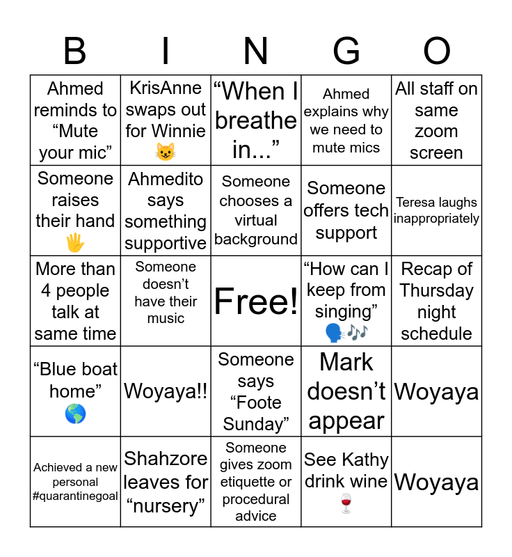 This bingo card has a free space and 24 words: Woyaya!!, Shahzore leaves for “nursery”, Someone chooses a virtual background, Achieved a new personal #quarantinegoal, All staff on same zoom screen, Ahmed reminds to “Mute your mic”, Someone raises their hand 🖐, KrisAnne swaps out for Winnie 😺, “How can I keep from singing” 🗣🎶, Someone says “Foote Sunday”, Someone offers tech support, More than 4 people talk at same time, Mark doesn’t appear, Woyaya, Ahmedito says something supportive, See Kathy drink wine 🍷, Recap of Thursday night schedule, “When I breathe in...”, Teresa laughs inappropriately, Someone doesn’t have their music, Woyaya, “Blue boat home” 🌎, Ahmed explains why we need to mute mics and Someone gives zoom etiquette or procedural advice.