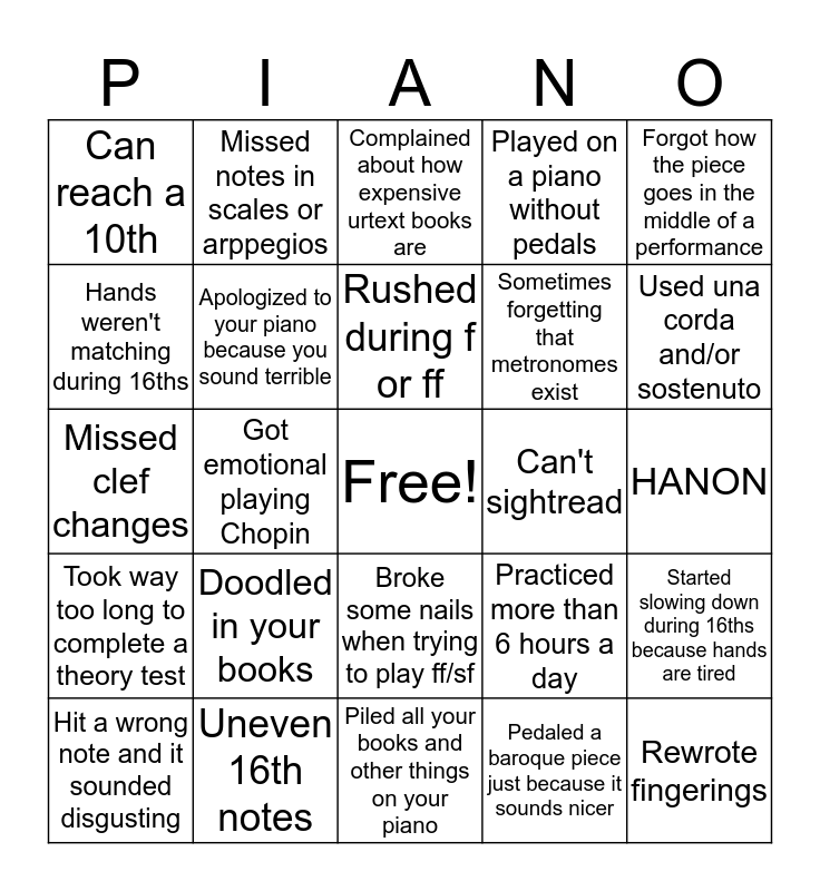 This bingo card has a free space and 24 words: Doodled in your books, Uneven 16th notes, Rushed during f or ff, Hit a wrong note and it sounded disgusting, Forgot how the piece goes in the middle of a performance, Can reach a 10th, Hands weren't matching during 16ths, Missed notes in scales or arppegios, Can't sightread, Broke some nails when trying to play ff/sf, Sometimes forgetting that metronomes exist, Missed clef changes, Practiced more than 6 hours a day, Started slowing down during 16ths because hands are tired, Apologized to your piano because you sound terrible, Pedaled a baroque piece just because it sounds nicer, HANON, Complained about how expensive urtext books are, Used una corda and/or sostenuto, Got emotional playing Chopin, Rewrote fingerings, Took way too long to complete a theory test, Played on a piano without pedals and Piled all your books and other things on your piano.