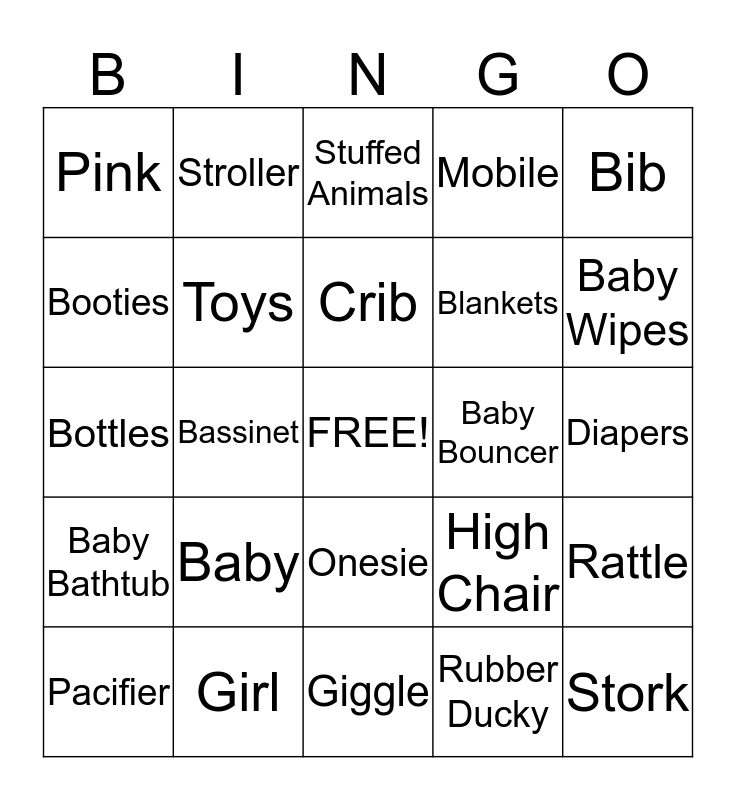 This bingo card has a free space and 24 words: Baby, Girl, Crib, Pacifier, Bib, Pink, Booties, Stroller, Baby Bouncer, Onesie, Blankets, Bottles, High Chair, Rattle, Toys, Rubber Ducky, Diapers, Stuffed Animals, Baby Wipes, Bassinet, Stork, Baby Bathtub, Mobile and Giggle.