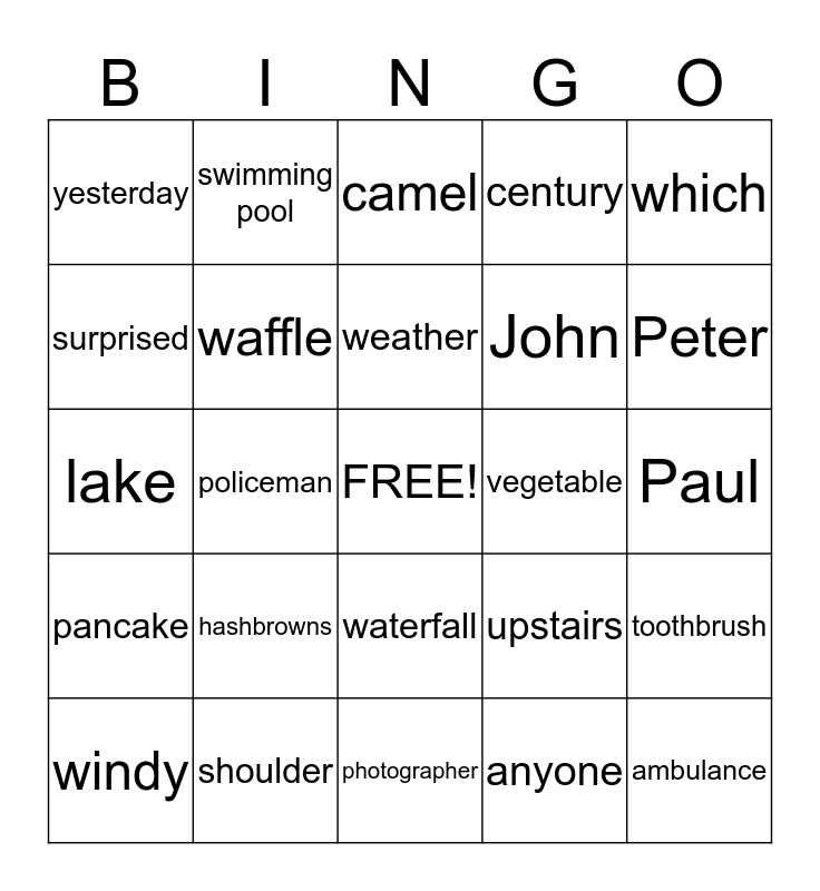 This bingo card has a free space and 24 words: hashbrowns, shoulder, weather, windy, which, yesterday, surprised, swimming pool, vegetable, waterfall, John, lake, upstairs, toothbrush, waffle, anyone, Paul, camel, Peter, policeman, ambulance, pancake, century and photographer.