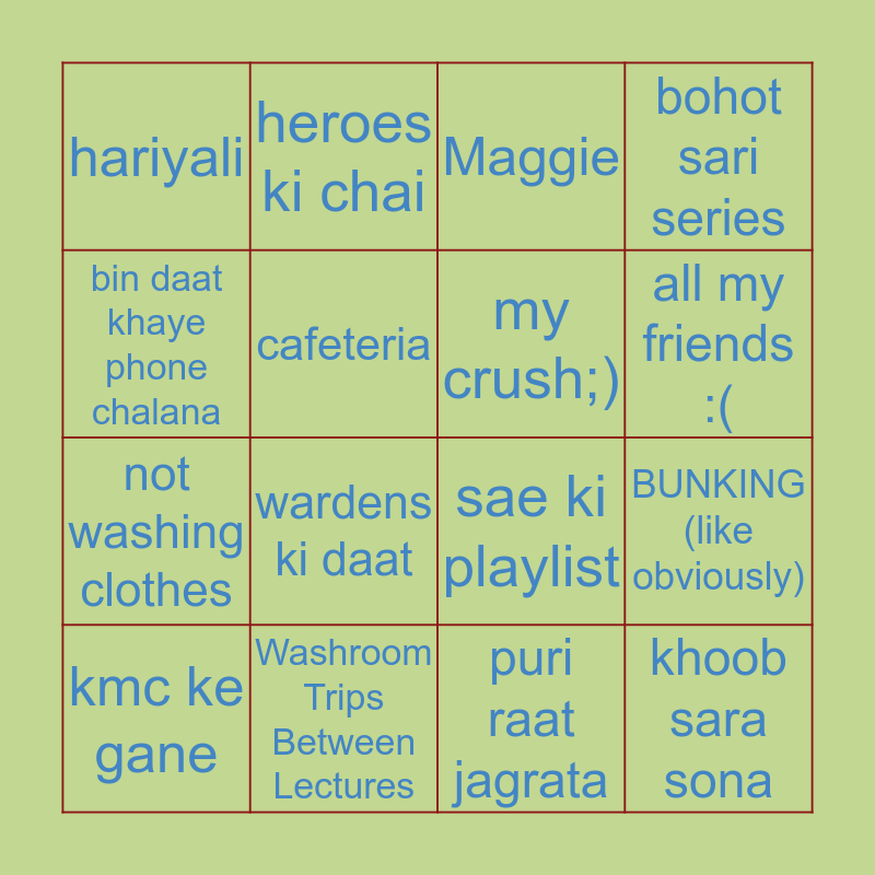 This bingo card has 16 words: Washroom Trips Between Lectures, BUNKING (like obviously), Maggie, hariyali, not washing clothes, heroes ki chai, sae ki playlist, puri raat jagrata, bin daat khaye phone chalana, cafeteria, kmc ke gane, bohot sari series, wardens ki daat, all my friends :(, my crush;) and khoob sara sona.