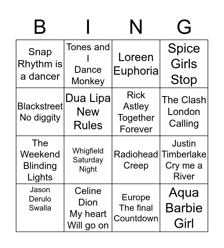 This bingo card has 29 words: Blackstreet No Diggity, Benny Benassi Satisfaction, Justin Timberlake Cry me a River, The Ting Tings That's not my name, Snap Rhythm is a dancer, Loreen Euphoria, Rick Astley Together Forever, Bob the builder song, Celine Dion My heart Will go on, Eminem The real slim shady, Europe The final Countdown, Jason Derulo Swalla, Rihanna We found love, Arctic Monkeys I bet you look good on the dancefloor, Whigfield Saturday Night, Genuine My pony, S Club 7 Reach, Aqua Barbie Girl, Blackstreet No diggity, Radiohead Creep, Hot Chip Ready for the floor, TLC No Scrubs, The Weekend Blinding Lights, Dua Lipa New Rules, Spice Girls Stop, Tones and I Dance Monkey, Swedish House Mafia Don't you worry child, The Clash London Calling and PJ and Duncan Let's get ready to rumble.