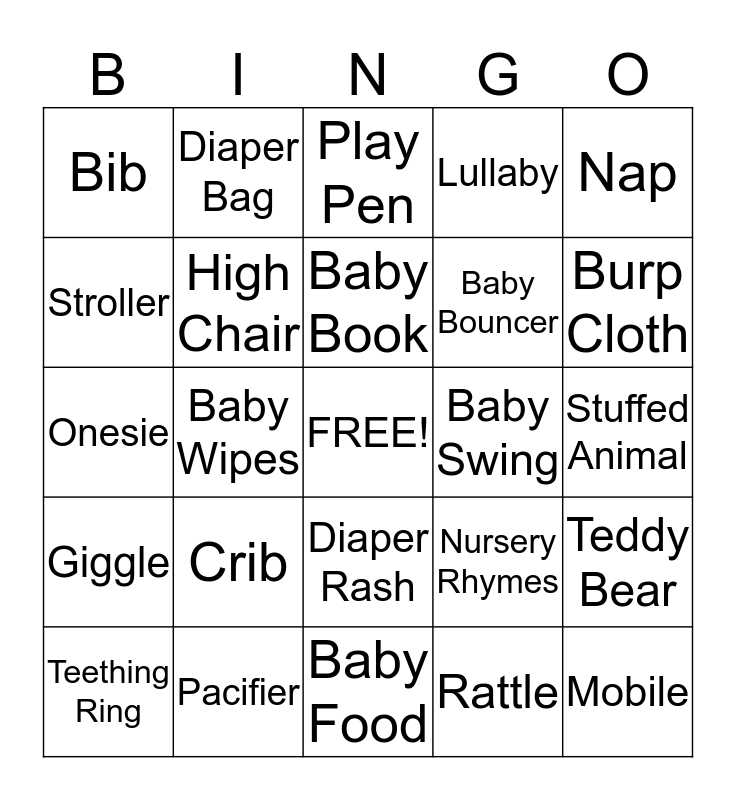 This bingo card has a free space and 24 words: Crib, Pacifier, Baby Book, Teething Ring, Nap, Bib, Stroller, Diaper Bag, Baby Swing, Diaper Rash, Baby Bouncer, Onesie, Nursery Rhymes, Teddy Bear, High Chair, Rattle, Stuffed Animal, Play Pen, Burp Cloth, Baby Wipes, Mobile, Giggle, Lullaby and Baby Food.