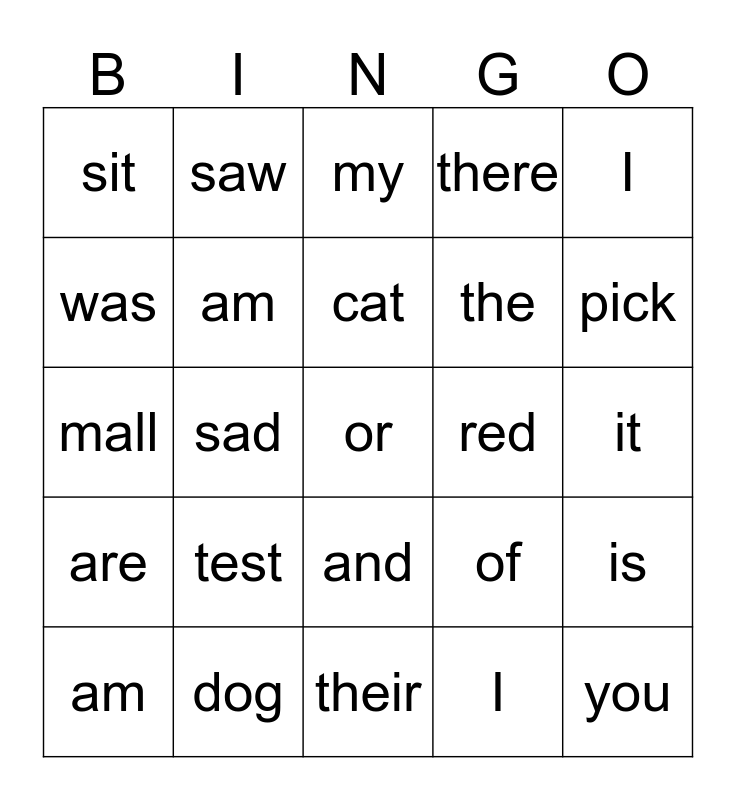 This bingo card has a free space and 24 words: test, dog, cat, am, I, sit, was, saw, red, and, the, mall, of, is, am, I, it, my, pick, sad, you, are, there and their.
