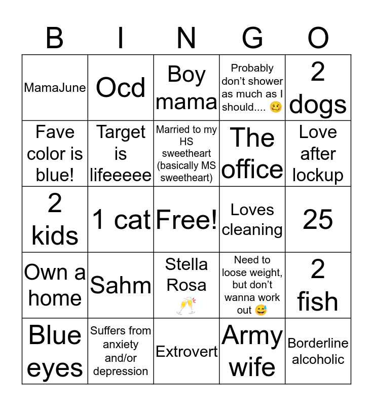 This bingo card has a free space and 24 words: Sahm, Suffers from anxiety and/or depression, Married to my HS sweetheart (basically MS sweetheart), Blue eyes, 2 dogs, MamaJune, Fave color is blue!, Ocd, Loves cleaning, Stella Rosa 🥂, The office, 2 kids, Need to loose weight, but don’t wanna work out 😅, 2 fish, Target is lifeeeee, Army wife, 25, Boy mama, Love after lockup, 1 cat, Borderline alcoholic, Own a home, Probably don’t shower as much as I should.... 🥴 and Extrovert.