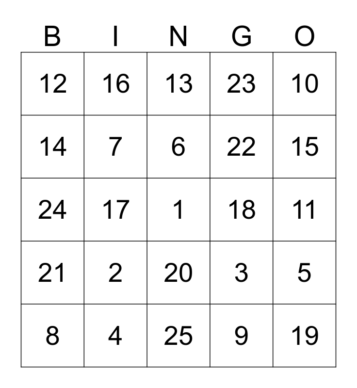 This bingo card has a free space and 24 words: 2, 4, 6, 8, 10, 12, 14, 16, 18, 20, 22, 24, 3, 5, 7, 9, 11, 13, 15, 17, 19, 21, 23 and 25.
