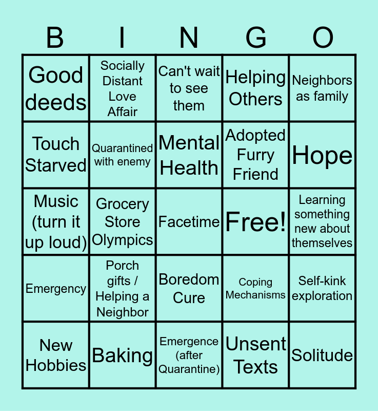 This bingo card has a free space and 24 words: Porch gifts / Helping a Neighbor, Baking, Mental Health, New Hobbies, Neighbors as family, Good deeds, Touch Starved, Socially Distant Love Affair, Free!, Boredom Cure, Adopted Furry Friend, Music (turn it up loud), Coping Mechanisms, Self-kink exploration, Quarantined with enemy, Unsent Texts, Learning something new about themselves, Can't wait to see them, Hope, Grocery Store Olympics, Solitude, Emergency, Helping Others and Emergence (after Quarantine).