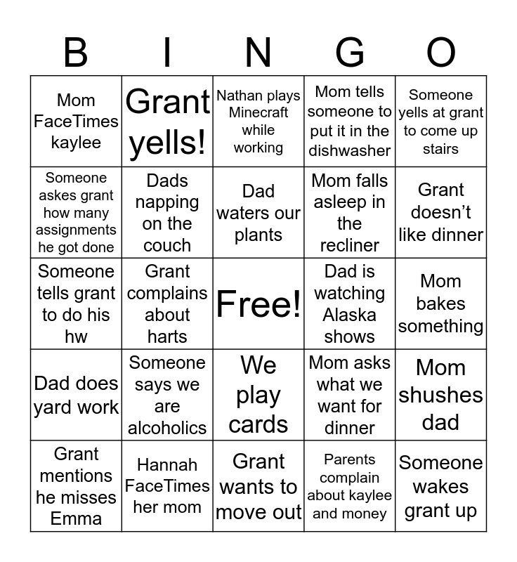 This bingo card has a free space and 24 words: Someone says we are alcoholics, Hannah FaceTimes her mom, Dad waters our plants, Grant mentions he misses Emma, Someone yells at grant to come up stairs, Mom FaceTimes kaylee, Someone askes grant how many assignments he got done, Grant yells!, Dad is watching Alaska shows, We play cards, Mom falls asleep in the recliner, Someone tells grant to do his hw, Mom asks what we want for dinner, Mom shushes dad, Dads napping on the couch, Parents complain about kaylee and money, Mom bakes something, Nathan plays Minecraft while working, Grant doesn’t like dinner, Grant complains about harts, Someone wakes grant up, Dad does yard work, Mom tells someone to put it in the dishwasher and Grant wants to move out.