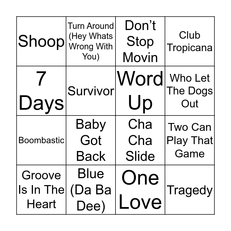 This bingo card has 64 words: I Want It That Way, Keep On Movin, Everybody (Backstreets Back), Tragedy, Just A Little, Bye Bye Bye, Don’t Stop Movin, S Club Party, 7 Days, All Rise, One Love, Starlight, Feel Good Inc, Survivor, Move Your Feet, Club Tropicana, Groove Is In The Heart, Turn Around (Hey Whats Wrong With You), I’m Your Man, Two Can Play That Game, Dancing Queen, The Fresh Prince Of Bel Air, Word Up, Mr Loverman, All Star, It Wasn’t me, The Tide Is High, Sound Of The Underground, Rock DJ, Genie In A Bottle, Scandalous, Oops! I Did It Again, Cheeky Song, Toxic, Cha Cha Slide, Dancing In The Moonlight, Whenever Wherever, A Thousand Miles, Believe, Who Let The Dogs Out, Boombastic, Blue (Da Ba Dee), Thong Song, Jump, Its Tricky, Baby Got Back, Jump Around, Bootylicios, Milkshake, Turn Me On, Here Comes The Hotstepper, Dirrty, Hey Ya!, Bad Boys For Life, I’ll Make Love To You, Pony, Shoop, Whatta Man, Don’t Stop Movin, Mysterious Girl, Mambo No.5, Livin La Vida Loca, Push It and U Cant Touch This.
