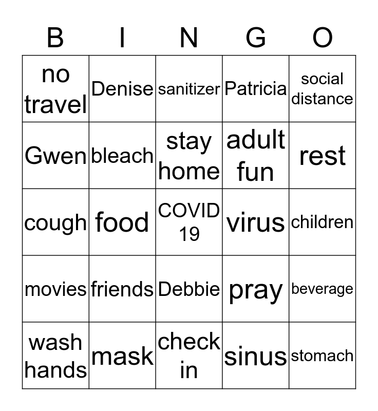 This bingo card has a free space and 29 words: wipes, mask, sanitizer, germs, social distance, no travel, bleach, stay home, virus, beverage, wash hands, food, sinus, stomach, cough, doctor, check in, pray, rest, movies, friends, family, adult fun, children, Gwen, Denise, Debbie, Patricia and Wanda.