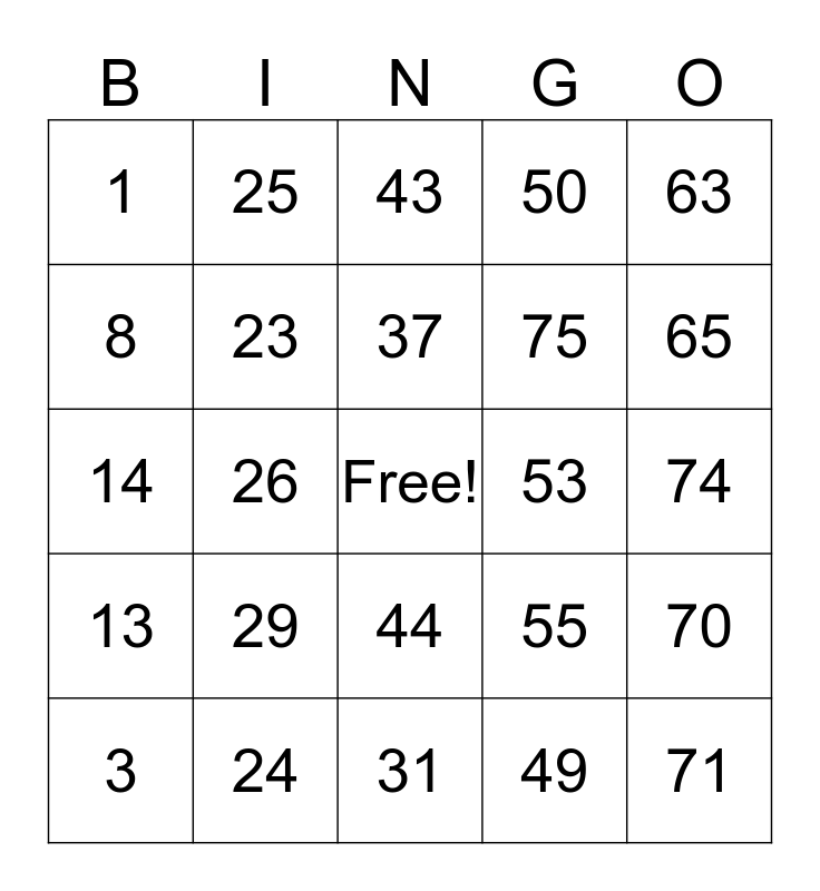 This bingo card has a free space and 24 words: 3, 29, 37, 49, 63, 1, 25, 43, 53, 74, 14, 23, 55, 70, 8, 24, 31, 50, 65, 13, 26, 44, 75 and 71.