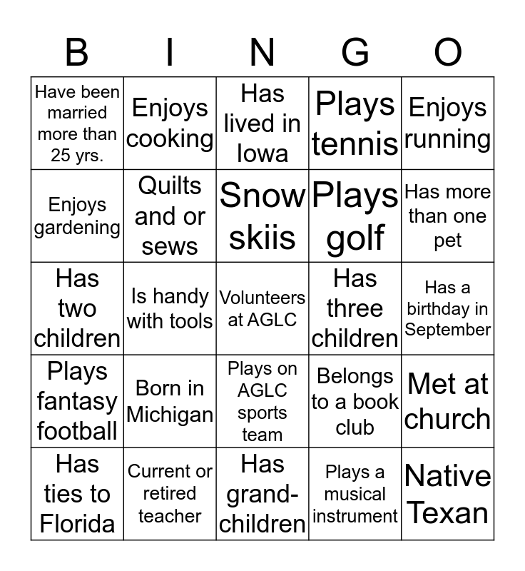 This bingo card has a free space and 24 words: Born in Michigan, Current or retired teacher, Snow skiis, Has ties to Florida, Enjoys running, Have been married more than 25 yrs., Enjoys gardening, Enjoys cooking, Has three children, Plays on AGLC sports team, Plays golf, Has two children, Belongs to a book club, Met at church, Quilts and or sews, Plays a musical instrument, Has a birthday in September, Has lived in Iowa, Has more than one pet, Is handy with tools, Native Texan, Plays fantasy football, Plays tennis and Has grand-children.