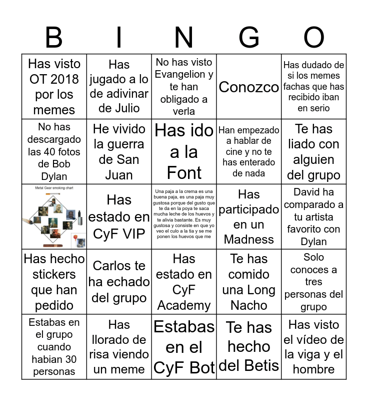 This bingo card has 1 images, a free space and 23 words: Carlos te ha echado del grupo, Has llorado de risa viendo un meme, Has ido a la Font, Estabas en el grupo cuando habian 30 personas, Has dudado de si los memes fachas que has recibido iban en serio, Has visto OT 2018 por los memes, No has descargado las 40 fotos de Bob Dylan, Has jugado a lo de adivinar de Julio, Has participado en un Madness, Has estado en CyF Academy, Han empezado a hablar de cine y no te has enterado de nada, Te has comido una Long Nacho, Solo conoces a tres personas del grupo, He vivido la guerra de San Juan, Te has hecho del Betis, David ha comparado a tu artista favorito con Dylan, No has visto Evangelion y te han obligado a verla, Te has liado con alguien del grupo, Has estado en CyF VIP, Has visto el vídeo de la viga y el hombre, Has hecho stickers que han pedido, Conozco and Estabas en el CyF Bot.