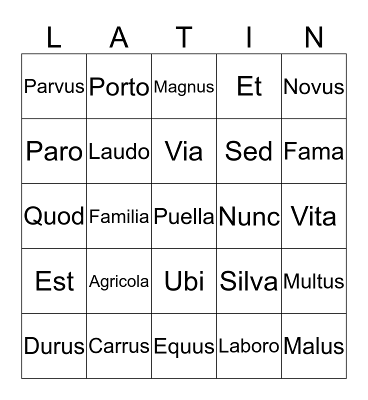 This bingo card has a free space and 24 words: Agricola, Carrus, Via, Durus, Novus, Parvus, Paro, Porto, Nunc, Ubi, Sed, Quod, Silva, Multus, Laudo, Laboro, Vita, Magnus, Fama, Familia, Malus, Est, Et and Equus.