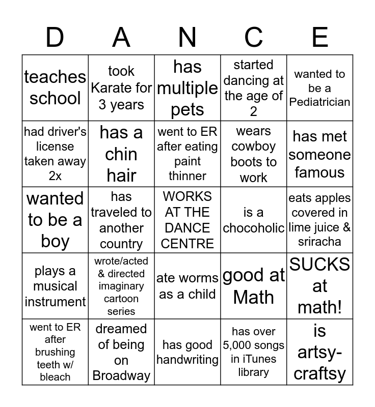 This bingo card has a free space and 24 words: wrote/acted & directed imaginary cartoon series, dreamed of being on Broadway, went to ER after eating paint thinner, went to ER after brushing teeth w/ bleach, wanted to be a Pediatrician, teaches school, had driver's license taken away 2x, took Karate for 3 years, is a chocoholic, ate worms as a child, wears cowboy boots to work, wanted to be a boy, good at Math, SUCKS at math!, has a chin hair, has over 5,000 songs in iTunes library, eats apples covered in lime juice & sriracha, has multiple pets, has met someone famous, has traveled to another country, is artsy-craftsy, plays a musical instrument, started dancing at the age of 2 and has good handwriting.