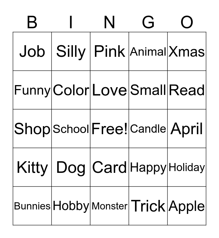 This bingo card has a free space and 24 words: Dog, Hobby, Love, Bunnies, Xmas, Job, Funny, Silly, Candle, Card, Small, Shop, Happy, Holiday, Color, Trick, April, Pink, Read, School, Apple, Kitty, Animal and Monster.