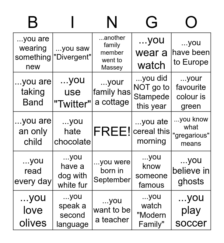This bingo card has a free space and 24 words: ...you have a dog with white fur, ...you speak a second language, ...your family has a cottage, ...you love olives, ...you have been to Europe, ...you are wearing something new, ...you are taking Band, ...you saw "Divergent", ...you ate cereal this morning, ...you were born in September, ...you did NOT go to Stampede this year, ...you are an only child, ...you know someone famous, ...you believe in ghosts, ...you use "Twitter", ...you watch "Modern Family", ...you know what "gregarious" means, ...another family member went to Massey, ...your favourite colour is green, ...you hate chocolate, ...you play soccer, ...you read every day, ...you wear a watch and ...you want to be a teacher.