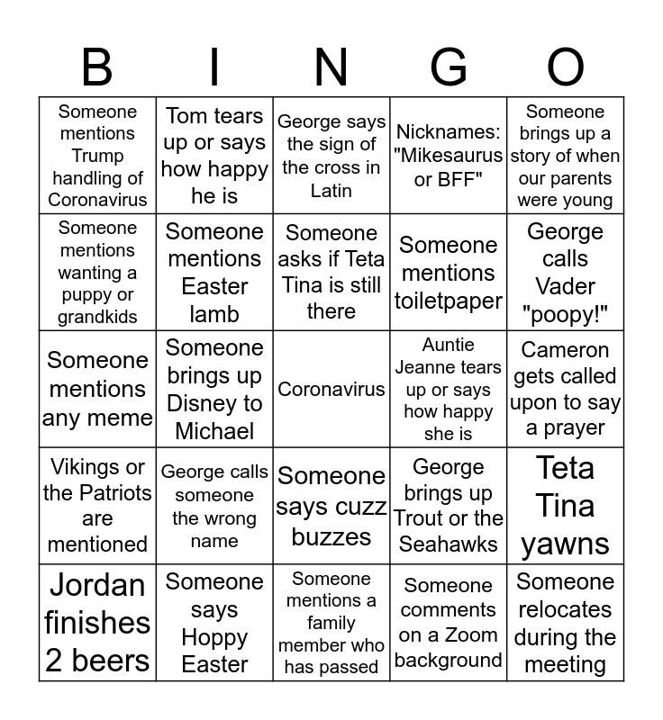 This bingo card has a free space and 24 words: George calls someone the wrong name, Someone says Hoppy Easter, Someone asks if Teta Tina is still there, Jordan finishes 2 beers, Someone brings up a story of when our parents were young, Someone mentions Trump handling of Coronavirus, Someone mentions wanting a puppy or grandkids, Tom tears up or says how happy he is, Auntie Jeanne tears up or says how happy she is, Someone says cuzz buzzes, Someone mentions toiletpaper, Someone mentions any meme, George brings up Trout or the Seahawks, Teta Tina yawns, Someone mentions Easter lamb, Someone comments on a Zoom background, Cameron gets called upon to say a prayer, George says the sign of the cross in Latin, George calls Vader "poopy!", Someone brings up Disney to Michael, Someone relocates during the meeting, Vikings or the Patriots are mentioned, Nicknames: "Mikesaurus or BFF" and Someone mentions a family member who has passed.