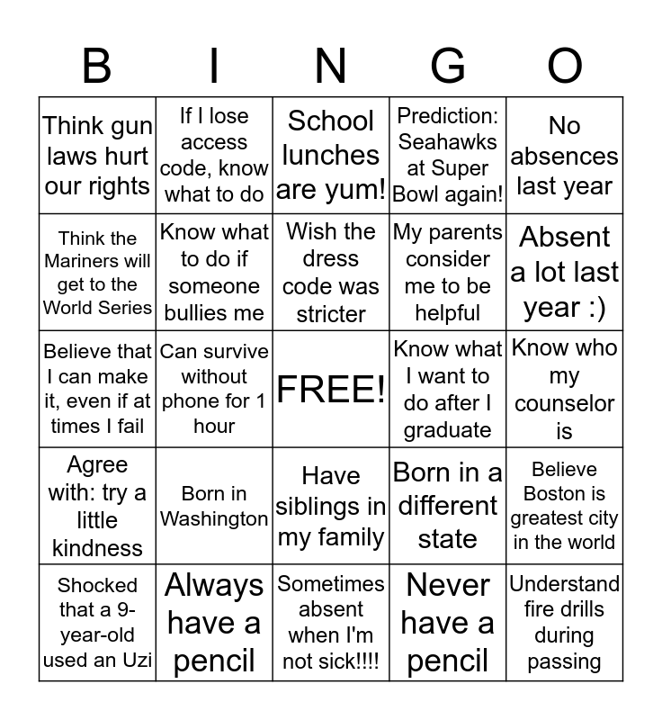 This bingo card has a free space and 24 words: Born in Washington, Always have a pencil, Wish the dress code was stricter, Shocked that a 9-year-old used an Uzi, No absences last year, Think gun laws hurt our rights, Think the Mariners will get to the World Series, If I lose access code, know what to do, Know what I want to do after I graduate, Have siblings in my family, My parents consider me to be helpful, Believe that I can make it, even if at times I fail, Born in a different state, Believe Boston is greatest city in the world, Know what to do if someone bullies me, Never have a pencil, Know who my counselor is, School lunches are yum!, Absent a lot last year :), Can survive without phone for 1 hour, Understand fire drills during passing, Agree with: try a little kindness, Prediction: Seahawks at Super Bowl again! and Sometimes absent when I'm not sick!!!!.