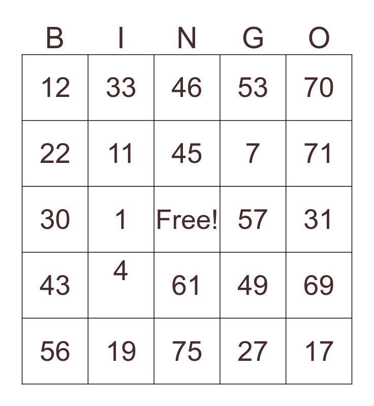 This bingo card has a free space and 24 words: 4, 19, 45, 56, 70, 12, 22, 33, 57, 61, 7, 30, 49, 69, 11, 27, 31, 46, 71, 1, 17, 43, 53 and 75.