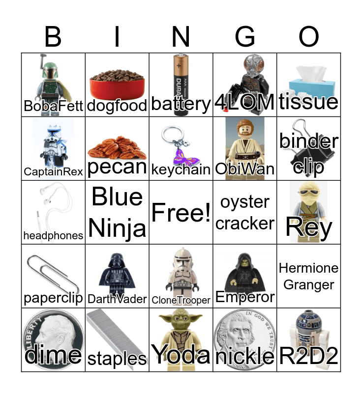 This bingo card has 29 images, a free space and 34 words: penny, nickle, quarter, tack, paperclip, pecan, tissue, dime, dogfood, dollar, keychain, battery, post-it, magnet, oyster cracker, binder clip, staples, headphones, DarthVader, Emperor, CloneTrooper, BattleDroid, BobaFett, Rey, Yoda, R2D2, 4LOM, AdmiralAckbar, ObiWan, CaptainRex, 1stOrderOfficer, Blue Ninja, Hermione Granger and Minecraft Player.