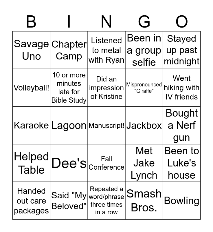This bingo card has a free space and 24 words: Dee's, Said "My Beloved", Did an impression of Kristine, Handed out care packages, Stayed up past midnight, Savage Uno, Volleyball!, Chapter Camp, Jackbox, Fall Conference, Mispronounced "Giraffe", Karaoke, Met Jake Lynch, Been to Luke's house, 10 or more minutes late for Bible Study, Smash Bros., Bought a Nerf gun, Listened to metal with Ryan, Went hiking with IV friends, Lagoon, Bowling, Helped Table, Been in a group selfie and Repeated a word/phrase three times in a row.