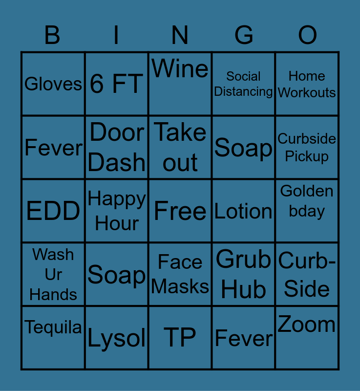 This bingo card has 1 images, a free space and 43 words: COVID-19, Zoom, Skype, Tequila, Bored, Fever, Wine, Coughing, Home Workouts, Lysol, Social Distancing, Lotion, Face Masks, Soap, Take out, TP, FaceTime, EDD, Paper towels, Curbside Pickup, 6 FT, Isolation, Tiger King, Gloves, Golden bday, Virtual, Whiskey, Grub Hub, Wash Ur Hands, PPE, Curb-Side, Truly, Champagne, Happy Hour, CLOSED, Face Masks, BevMo, Take out, Fever, Soap, Gym, Door Dash and Lysol.