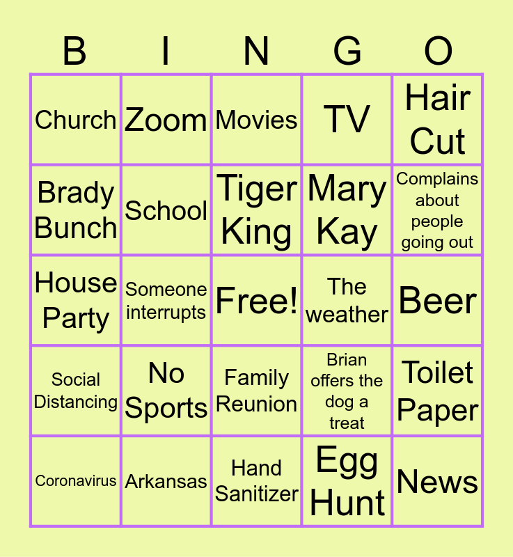 This bingo card has a free space and 30 words: Easter, Arkansas, Movies, Grocery Store, Hair Cut, Church, School, Tiger King, Mary Kay, News, Coronavirus, No Sports, Egg Hunt, Bunny, Social Distancing, Dogs, Hand Sanitizer, The weather, Toilet Paper, Brady Bunch, Someone interrupts, Liquor, TV, Beer, House Party, Zoom, Family Reunion, Brian offers the dog a treat, Complains about people going out and Germs.