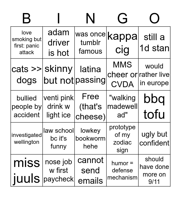 This bingo card has a free space and 24 words: law school bc it's funny, nose job w first paycheck, latina passing, miss juuls, still a 1d stan, love smoking but first: panic attack, cats >> dogs, adam driver is hot, "walking madewell ad", lowkey bookworm hehe, MMS cheer or CVDA, bullied people by accident, prototype of my zodiac sign, ugly but confident, skinny but not, humor = defense mechanism, bbq tofu, was once tumblr famous, would rather live in europe, venti pink drink w light ice, should have done more on 9/11, investigated wellington, kappa cig and cannot send emails.