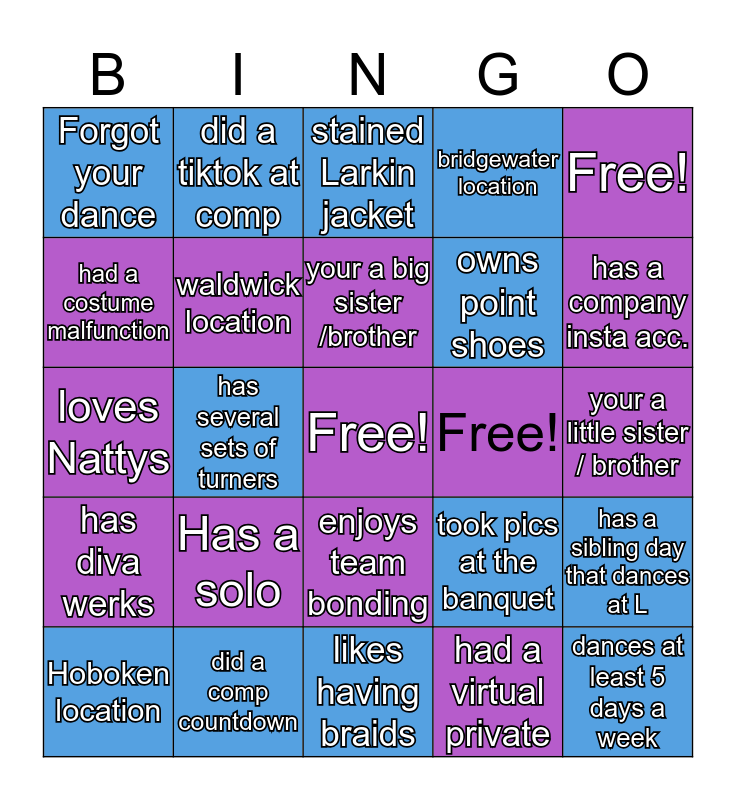 This bingo card has 25 words: Has a solo, likes having braids, your a big sister /brother, Hoboken location, Free!, Forgot your dance, had a costume malfunction, did a tiktok at comp, Free!, enjoys team bonding, owns point shoes, loves Nattys, took pics at the banquet, has a sibling day that dances at L, waldwick location, dances at least 5 days a week, your a little sister / brother, stained Larkin jacket, has a company insta acc., has several sets of turners, Free!, did a comp countdown, has diva werks, bridgewater location and had a virtual private.