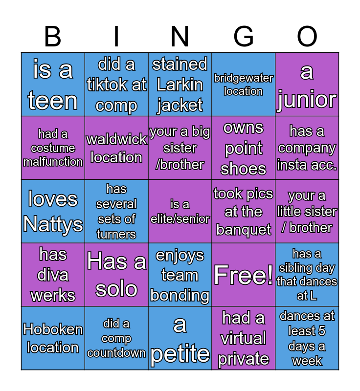 This bingo card has 25 words: Has a solo, a petite, your a big sister /brother, Hoboken location, a junior, is a teen, had a costume malfunction, did a tiktok at comp, took pics at the banquet, enjoys team bonding, owns point shoes, loves Nattys, Free!, has a sibling day that dances at L, waldwick location, dances at least 5 days a week, your a little sister / brother, stained Larkin jacket, has a company insta acc., has several sets of turners, is a elite/senior, did a comp countdown, has diva werks, bridgewater location and had a virtual private.