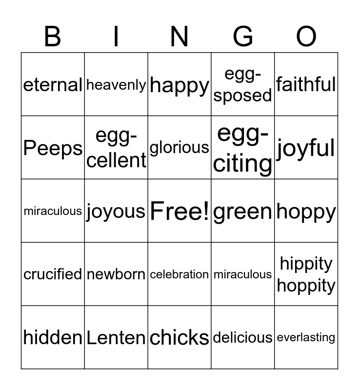 This bingo card has a free space and 58 words: Christian, Lenten, blessed, crucified, delicious, delightful, egg-cellent, egg-cited, egg-citing, egg-specially, egg-sposed, eggs-actly, eggs-travanganza, eggs-treme, eggstra-special, eternal, everlasting, faithful, festive, glorious, green, happy, hidden, hippity hoppity, holy, hoppy, immortal, inspirational, joyful, joyous, hidden, hippity hoppity, holy, hoppy, immortal, inspirational, joyful, joyous, miraculous, neverending, newborn, pastel, miraculous, neverending, bunny tracks, candy, carrot patch, celebration, chicks, children, chocolate, chocolate bunny, newborn, pastel, heavenly, Palm Sunday, Peeps and Pentecost.