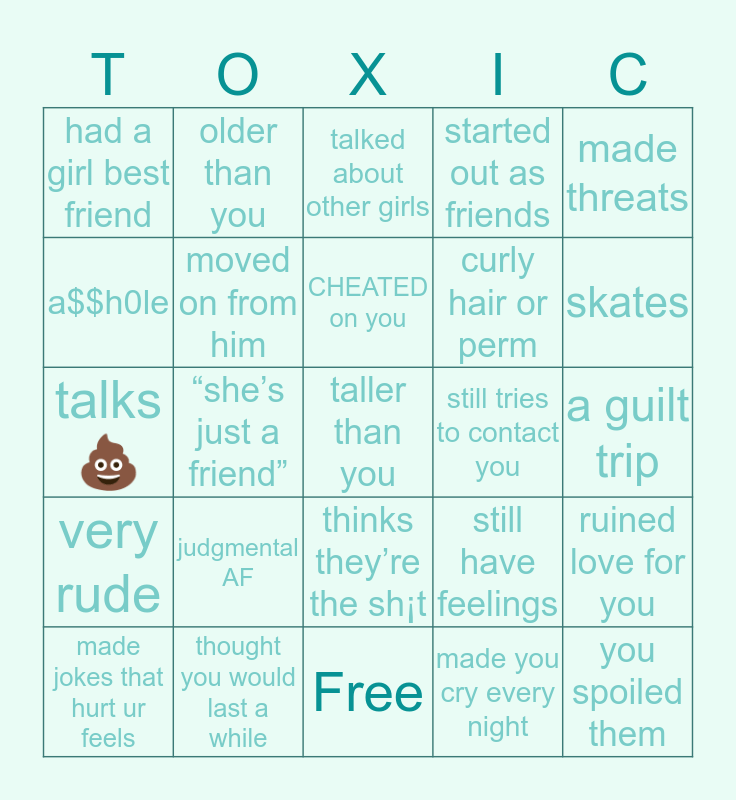 This bingo card has 25 words: very rude, thought you would last a while, taller than you, made you cry every night, made threats, had a girl best friend, older than you, talked about other girls, still tries to contact you, ruined love for you, a$$h0le, moved on from him, Free, still have feelings, skates, made jokes that hurt ur feels, “she’s just a friend”, CHEATED on you, curly hair or perm, a guilt trip, talks 💩, judgmental AF, thinks they’re the sh¡t, started out as friends and you spoiled them.