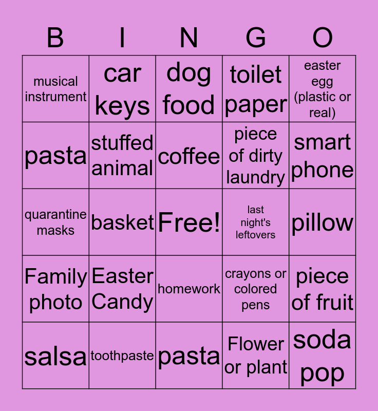 This bingo card has a free space and 29 words: salsa, stinky shoe, basket, water bottle, musical instrument, dog food, stuffed animal, Easter Candy, last night's leftovers, toothpaste, pillow, soda pop, pasta, Flower or plant, smart phone, unpaid bills, homework, Family photo, easter egg (plastic or real), quarantine masks, crayons or colored pens, germ-free cash, piece of dirty laundry, pasta, toilet paper, car keys, piece of fruit, coffee and stinky sock.
