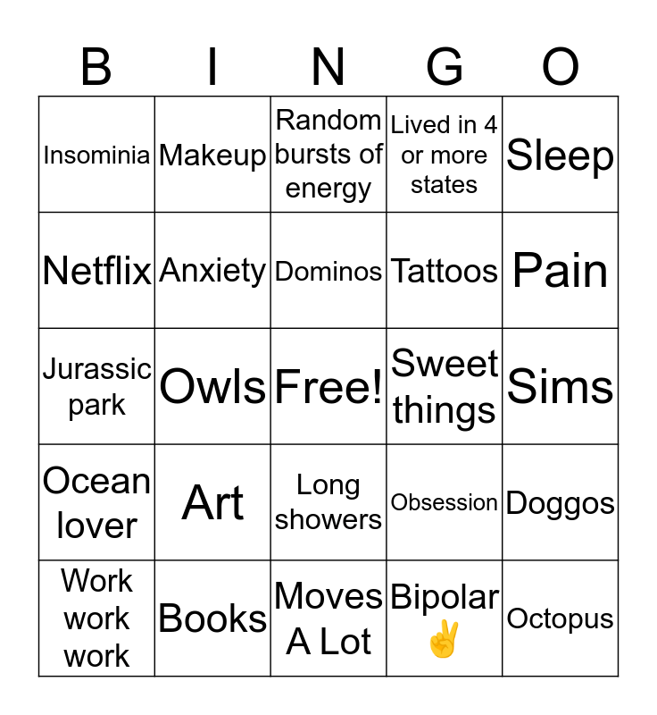 This bingo card has a free space and 24 words: Art, Books, Dominos, Work work work, Sleep, Insominia, Netflix, Makeup, Sweet things, Long showers, Tattoos, Jurassic park, Obsession, Doggos, Anxiety, Bipolar✌, Sims, Random bursts of energy, Pain, Owls, Octopus, Ocean lover, Lived in 4 or more states and Moves A Lot.