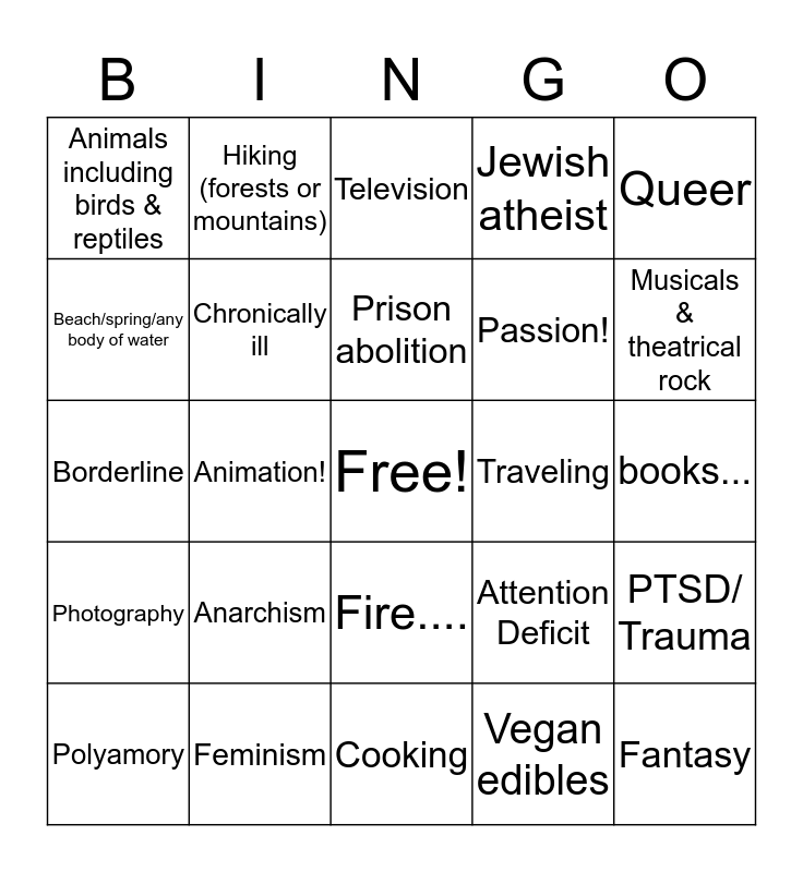 This bingo card has a free space and 24 words: Anarchism, Feminism, Prison abolition, Polyamory, Queer, Animals including birds & reptiles, Beach/spring/any body of water, Hiking (forests or mountains), Traveling, Fire...., Passion!, Borderline, Attention Deficit, PTSD/ Trauma, Chronically ill, Vegan edibles, books..., Television, Musicals & theatrical rock, Animation!, Fantasy, Photography, Jewish atheist and Cooking.