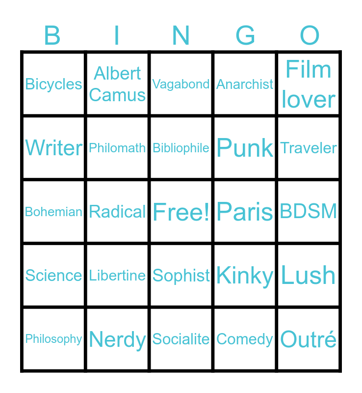 This bingo card has a free space and 24 words: Philosophy, Libertine, Bibliophile, Comedy, Film lover, Bicycles, Albert Camus, Vagabond, Paris, BDSM, Bohemian, Philomath, Kinky, Lush, Writer, Nerdy, Socialite, Anarchist, Traveler, Science, Radical, Sophist, Punk and Outré.
